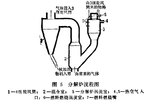 為了調整氣體動力學製度,分解爐內設有節流閘板,它位於混合室的圓錐形異徑管下部。分解爐工作的特性為:它完全依賴於回轉窯的操作製度。分解過的生料粉進入渦流室同回轉窯出來的熱廢氣相混合,並依靠廢氣熱令生料粉達到85-90%的分解。從混合室出來的含生料粉的氣體進入第四級旋風筒,生料粉在該筒內與氣流分開,並沿傾斜溜管進入回轉窯內。