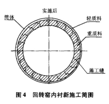 經過與原料廠家、大(da)修(xiu)部(bu)門(men)對(dui)該(gai)問(wen)題(ti)的(de)共(gong)同(tong)探(tan)討(tao),較(jiao)確(que)定(ding)將(jiang)原(yuan)有(you)兩(liang)條(tiao)澆(jiao)注(zhu)料(liao)之(zhi)間(jian)的(de)直(zhi)縫(feng)施(shi)工(gong)修(xiu)改(gai)為(wei)有(you)錯(cuo)台(tai)的(de)施(shi)工(gong)縫(feng),阻(zu)擋(dang)在(zai)高(gao)溫(wen)條(tiao)件(jian)下(xia)高(gao)溫(wen)炭(tan)粉(fen)由(you)施(shi)工(gong)縫(feng)進(jin)入(ru)輕(qing)質(zhi)料(liao)層(ceng)。回(hui)轉(zhuan)窯(yao)內(nei)襯(chen)新(xin)施(shi)工(gong)簡(jian)圖(tu)見(jian)圖(tu)4。此項措施較明顯地改善了內襯的使用狀況,次采用就使回轉窯內襯的使用壽命提高到了440天以上。