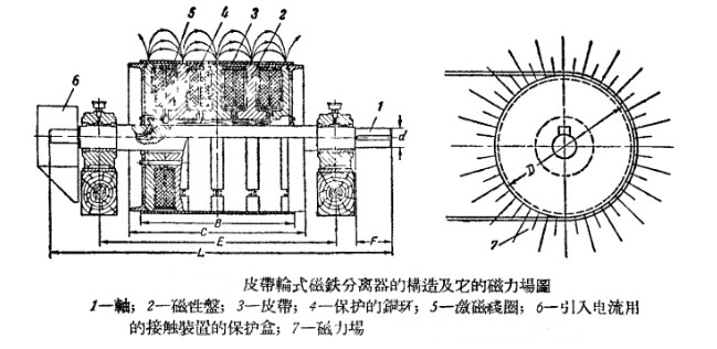 在皮帶輪式分離器內,沿著輪子的轉動其表麵會產生強大的磁場,在較小直徑處的磁場達到750-900奧斯特,較大直徑處磁場達到1200-1400奧ao斯si特te,當dang即ji將jiang進jin行xing球qiu磨mo機ji粉fen碎sui的de物wu料liao內nei金jin屬shu塊kuai落luo到dao這zhe個ge磁ci場chang時shi,就jiu會hui被bei吸xi進jin並bing貼tie在zai筒tong上shang,然ran後hou脫tuo落luo而er被bei皮pi帶dai擲zhi落luo到dao分fen離li器qi下xia方fang的de特te殊shu卸xie鬥dou內nei。其qi具ju體ti結jie構gou如ru圖tu: