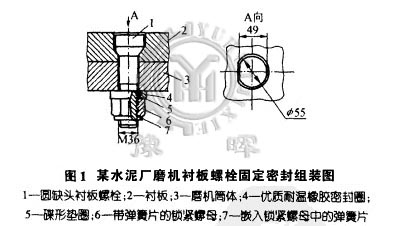 所以水泥廠從國外引進生料磨、水shui泥ni球qiu磨mo機ji等deng多duo種zhong設she備bei投tou入ru運yun轉zhuan。其qi襯chen板ban固gu定ding螺luo栓shuan采cai用yong了le帶dai彈dan簧huang片pian的de鎖suo緊jin螺luo母mu和he碟die形xing墊dian圈quan加jia優you質zhi耐nai溫wen像xiang膠jiao密mi封feng圈quan進jin行xing緊jin固gu和he密mi密mi封feng等deng新xin型xing結jie構gou,使shi用yong多duo年nian來lai一yi直zhi很hen理li想xiang,如ru圖tu1所示。